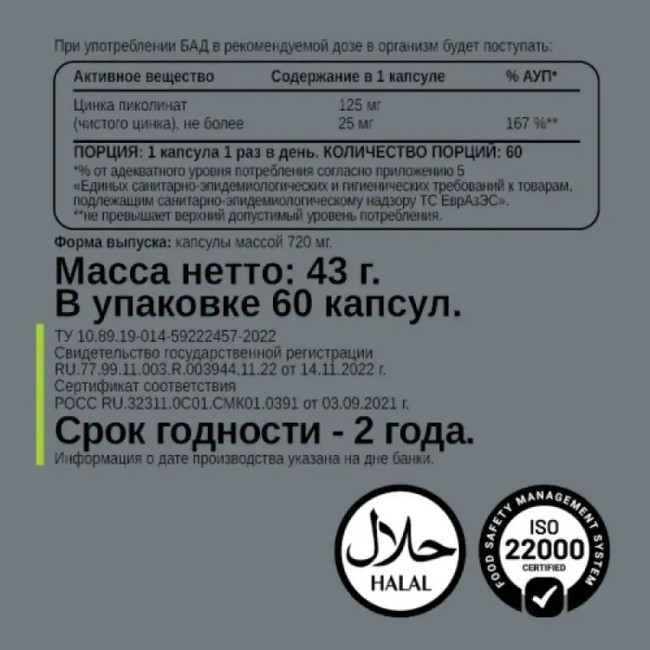 Цинк (в форме пиколината цинка) — 25 мг